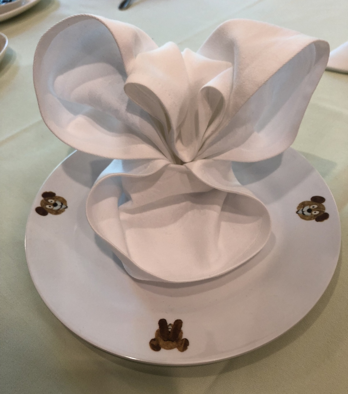 夕食と朝食はホテルのダイニングで。娘のナプキンがヨットだったり、ミニーちゃんだったり、ニクいサービスをしてくれました。