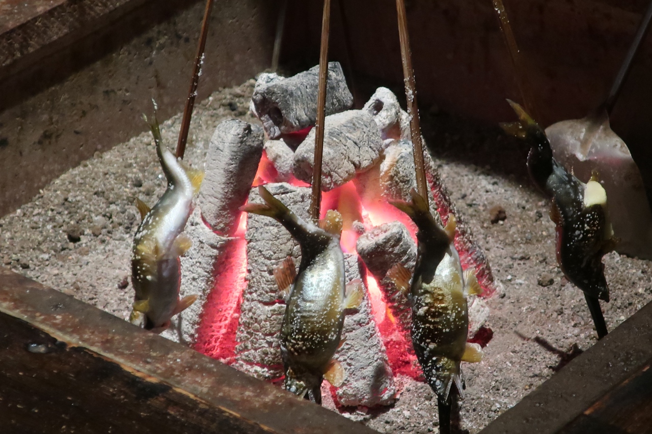 板前さんが部屋の囲炉裏でつきっきりで焼いてくれた、今シーズン最後の子持ち鮎は特に美味しゅうございました。