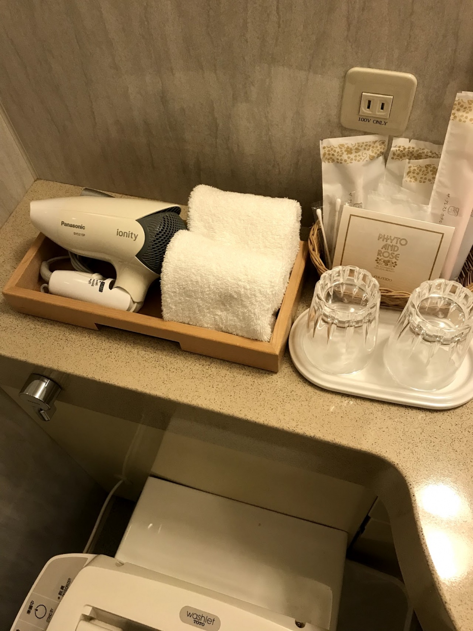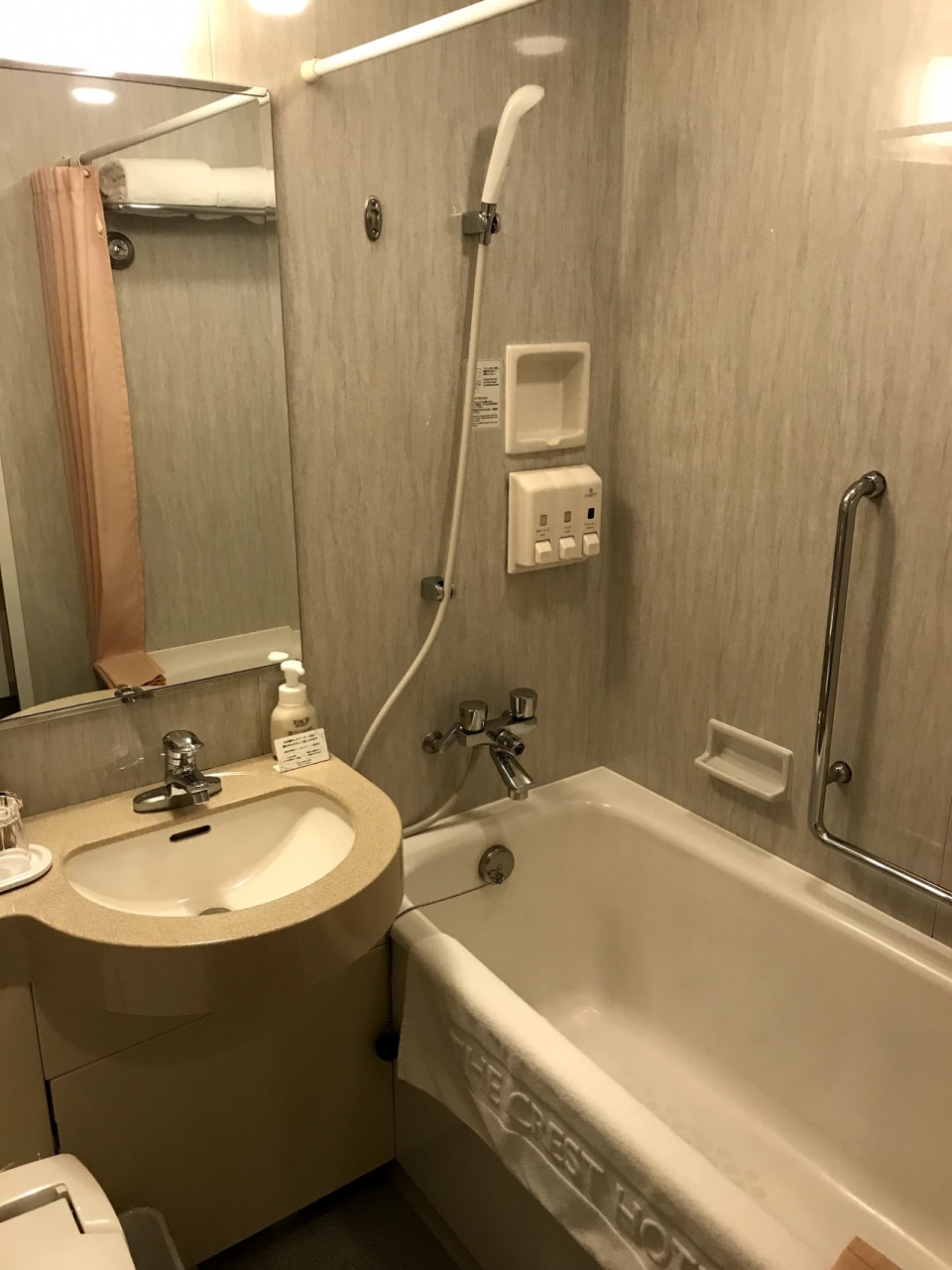 ビジネスホテルに比べると大きめのバスタブと、シャワーカーテンが折りたたんであったり高級感がありました。