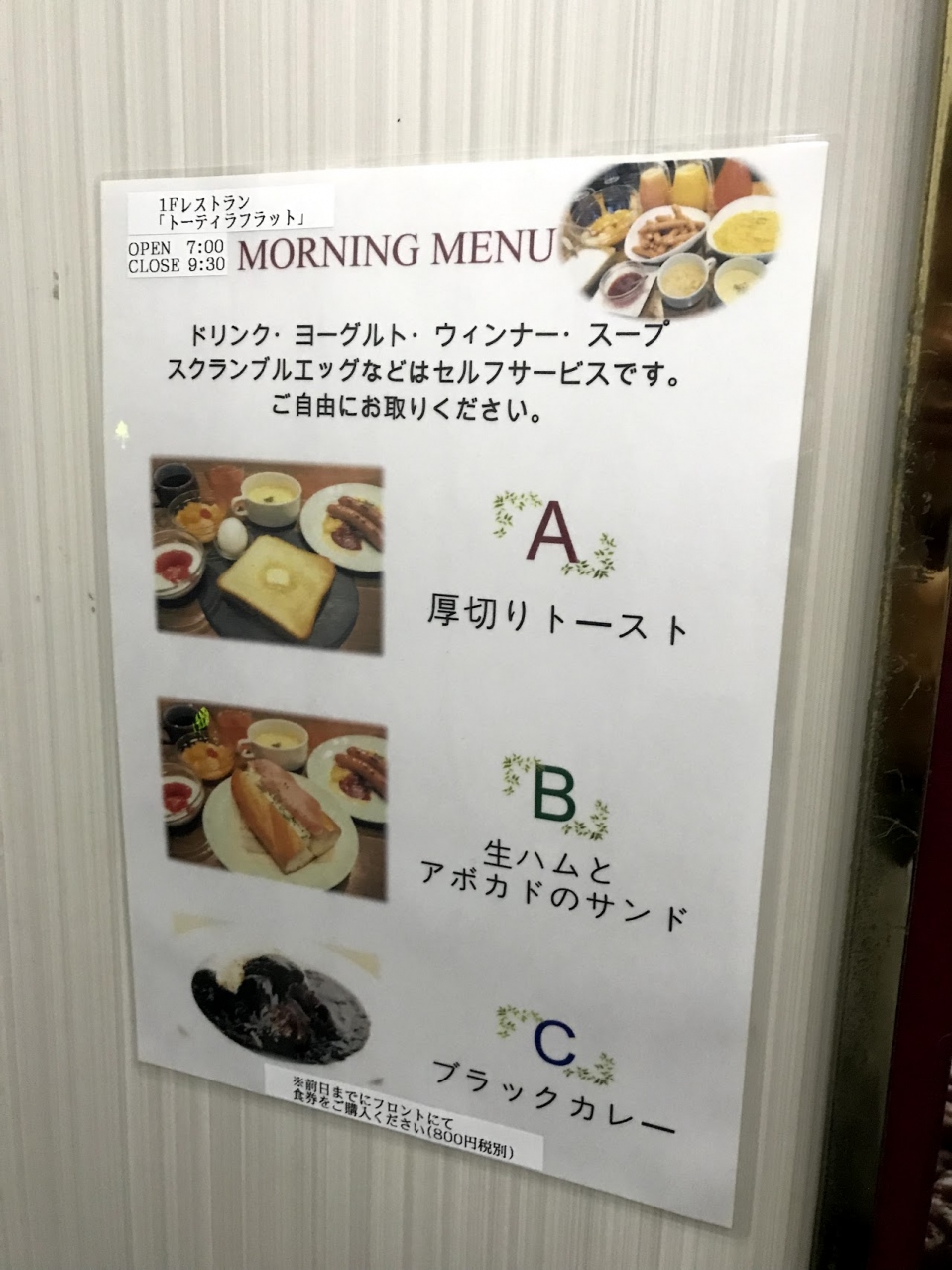 朝食は、トースト、ハムサンド、カレーから選びます。