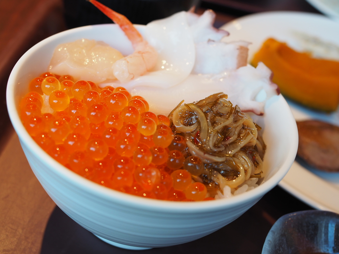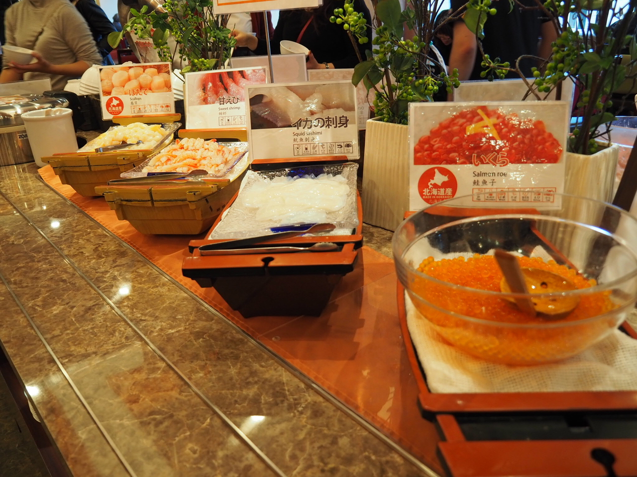 自分でイクラやサーモン、ホタテ、松前漬けなどを乗っけ放題の海鮮丼が作れ、スープカレーやハスカップジャムを乗っけたフレンチトーストも美味しかった。