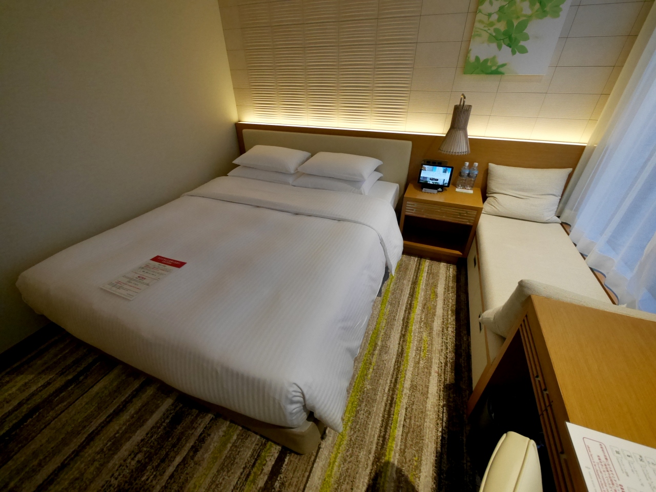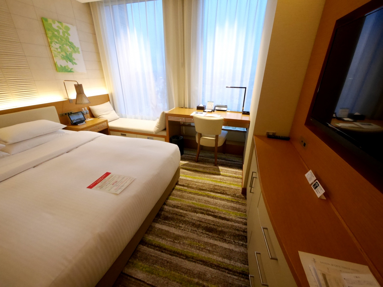 オフィスビルの上半分,それも奥のほうにある.たしかに濡れなくて行けるのだが,結構歩く 徒歩5分は誇大広告だ 新幹線の改札口だとゆうに8-9分はかかる 遠い遠い 15階にフロントはある.20階のダブルの部屋に宿泊.コンパクトな部屋だ.ベッドは大きく,スプリングもよく寝やすい.風呂もシティホテル水準.しかし部屋は少し狭く圧迫感がある.もう3平米くらいあると随分違うのだが,狭いね!朝食は種類も豊富,食材もいい.名古屋めしも手羽先から,味噌カツ,エビフライはてはひつまぶしまである.四つ星上といったところ.お皿で一つ一つ運ぶのがつらい.お盆があるといい!