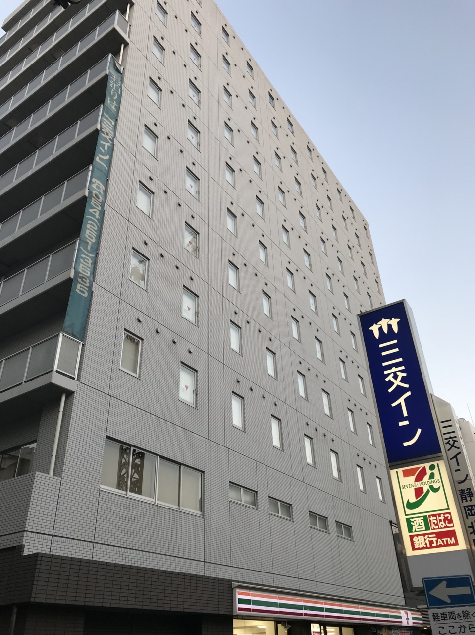 静岡駅から徒歩で10分以上かかりますが、静岡グルメの代表である『おでん』を楽しめるおでん横丁の近くにあり、その他も飲食店が豊富です。1階はコンビニですから出張には便利だと思います。