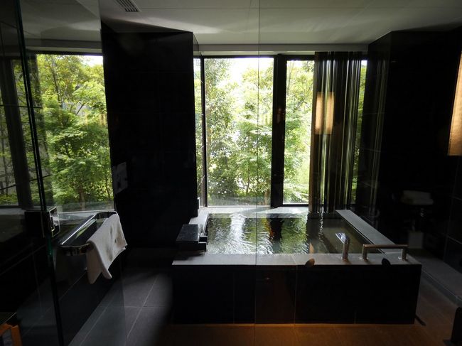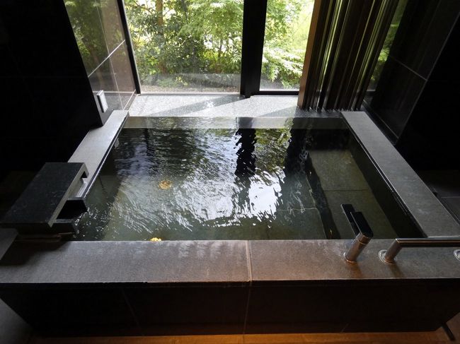 バスルームには天然温泉が引かれていて、24時間いつでもお部屋で温泉が楽しめるのも素敵です。