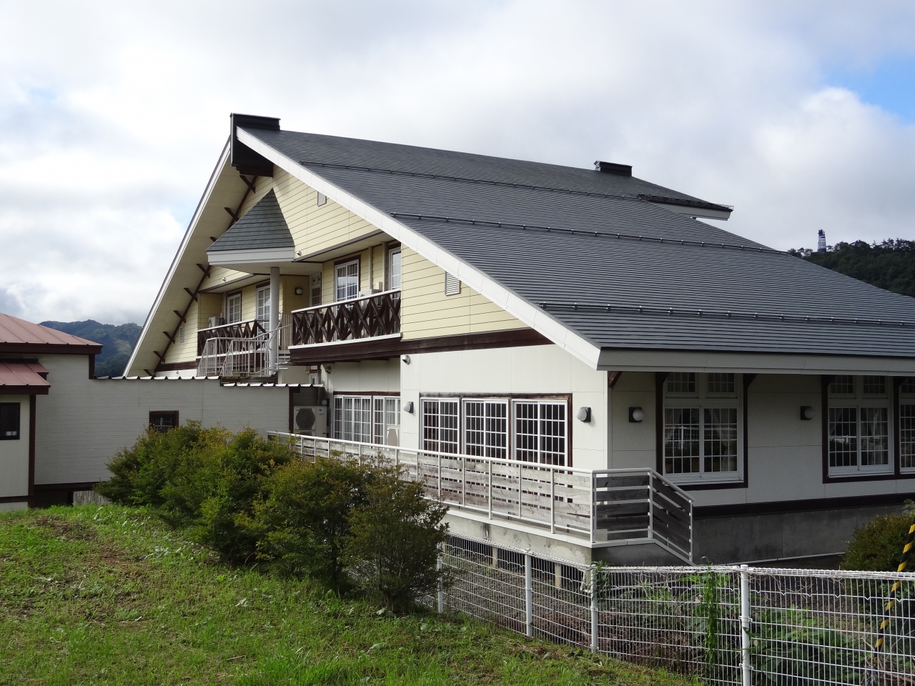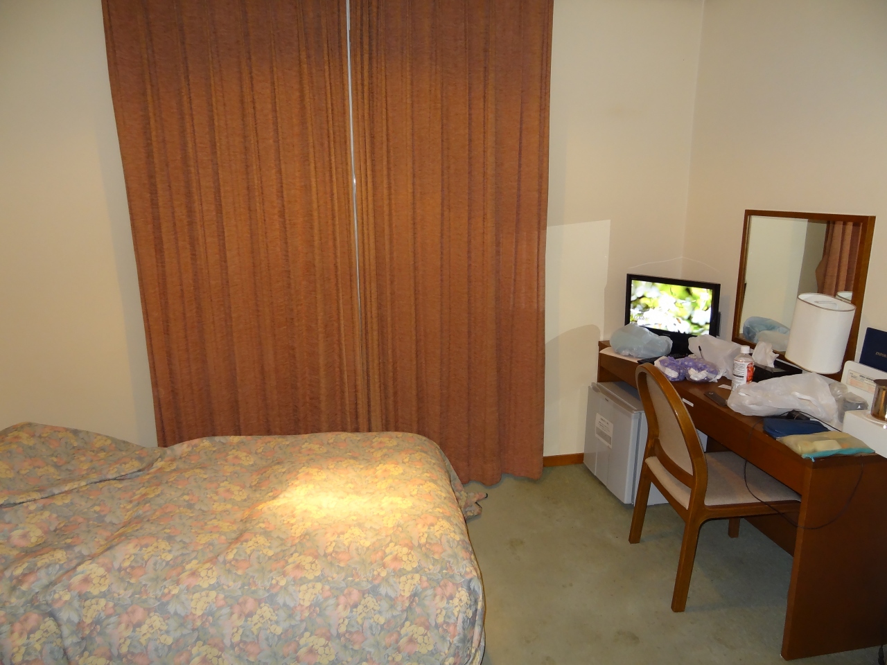 外観は、スイスのペンションのような建物ですが、建物内はまるでビジネスホテルです。部屋は狭く、トイレは風呂と一緒。まあ、日帰り入浴用の大浴場を無料で利用できますので、狭いバスに入る必要はありませんが。