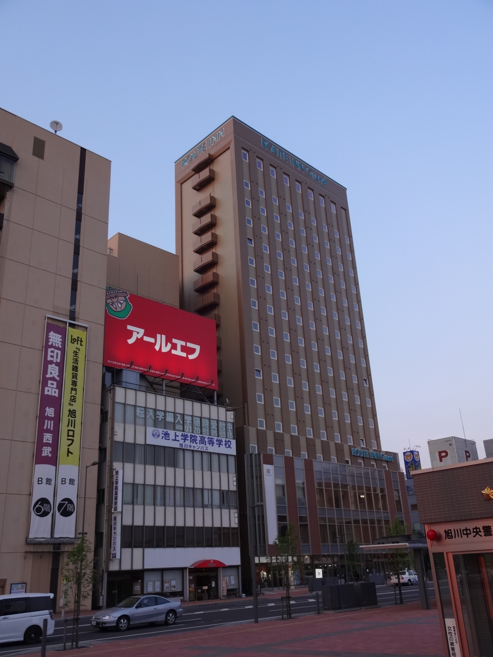 部屋は高層階でのため、見晴らしのいい景色に大きな窓はホントに解放感たっぷりで、いつまででも外を眺めていたい気分になった。部屋自体は狭いながらもベッドは広く、朝まで久しぶりにぐっすり眠ることができた。最上階の温泉も天人峡温泉、サウナ付と言うこと無し。1階にはレンタカー、隣のビルにはラーメンの山頭火、などもあり良かった。