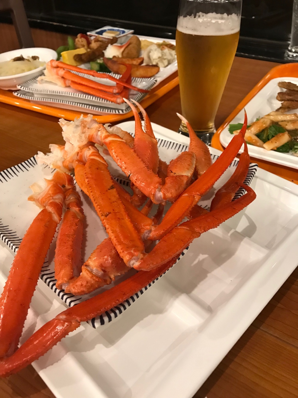 蟹食べ放題、ぶり7種料理フェアをやっていて蟹も食べ放題だが身のない蟹で量も少なかった。夕食にアルコールが飲み放題なのは嬉しい。