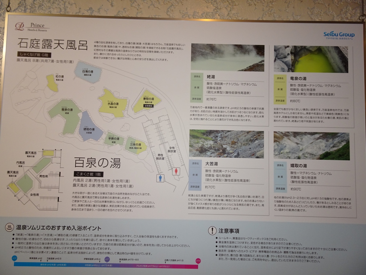 このホテルは4種類の源泉を持つ贅沢な温泉ホテルです。違う色の露天風呂が不思議な景色で楽しめます。露天風呂へは貸しタオルで入浴しますが、中には違うタオルを巻いてくる非常識な人もいて、残念です。食事は会場でビュッフェですが、品数も多く味も良かったので満足です。2泊して、近くにあるプリンスホテルとも提携していて、温泉入浴はサービスでした。大自然の中でのゆったりの時間に大満足の2日間でした。