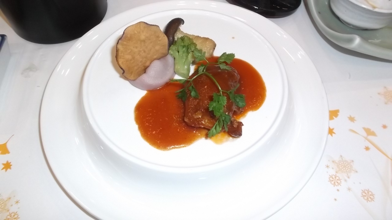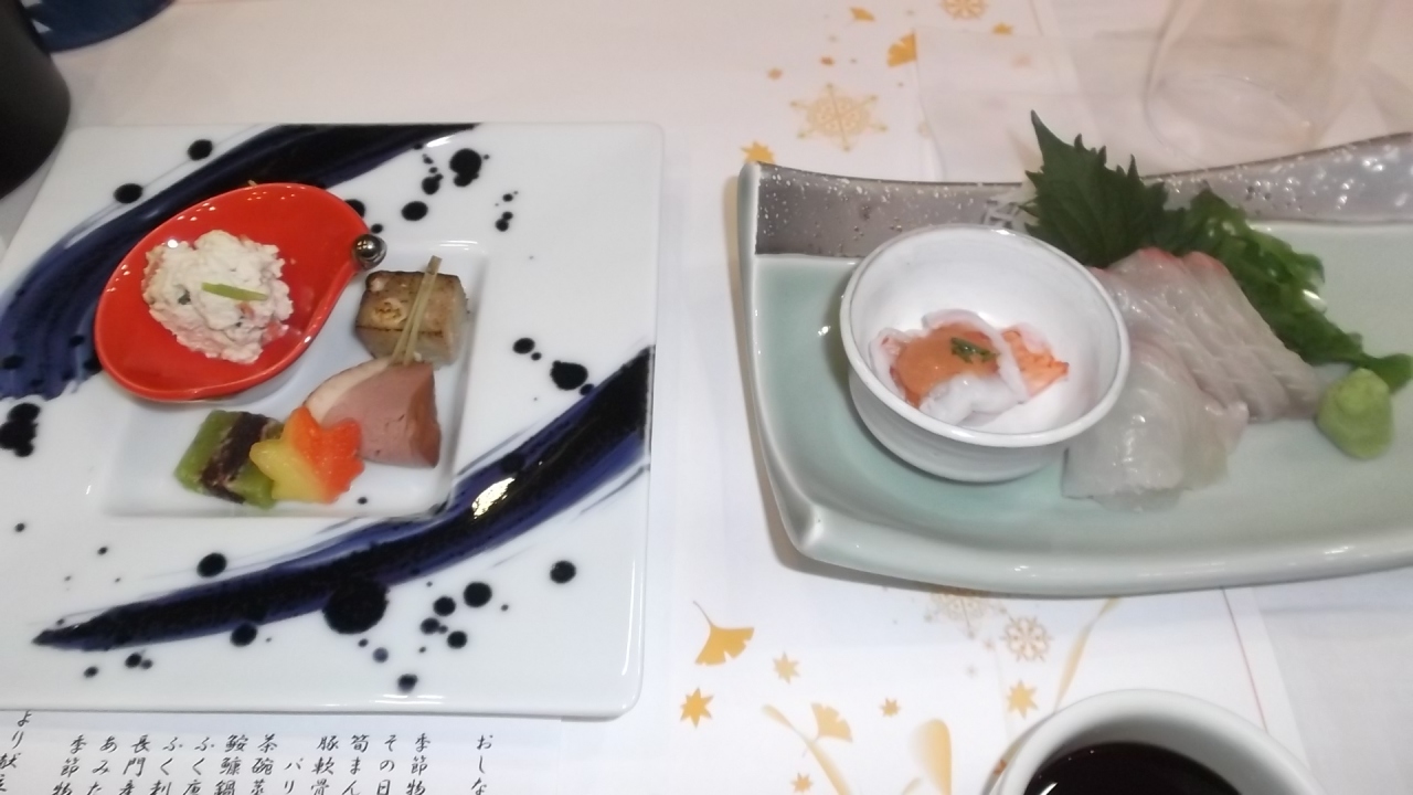 夕・朝食とも会席御膳で、特に夕食は「ふぐ料理付長州会席」(全12品)でお酒もすすみました。今話題の朱塗りの鳥居で有名な「元乃隅神社」はこのホテルからも近い距離にあります。