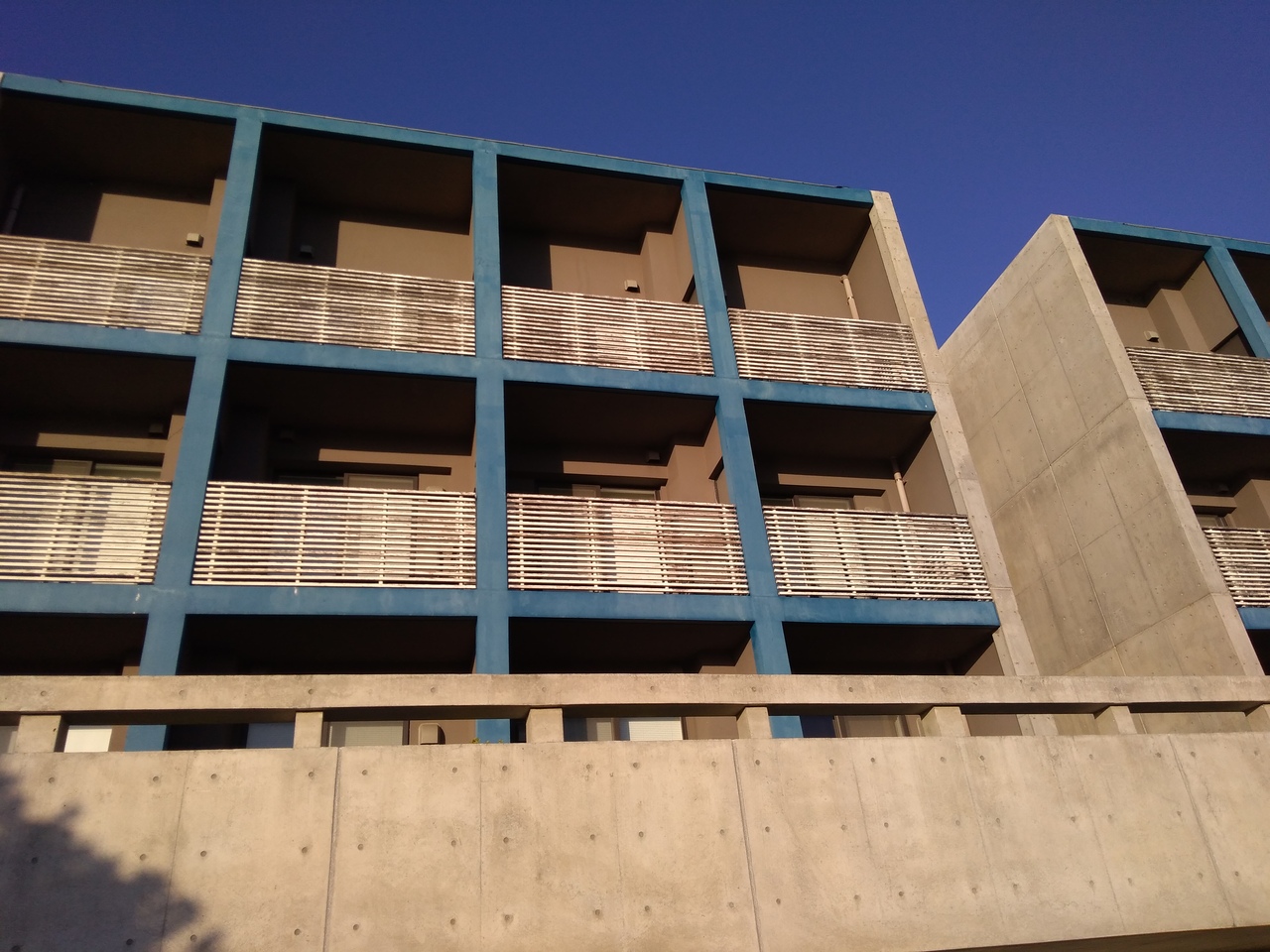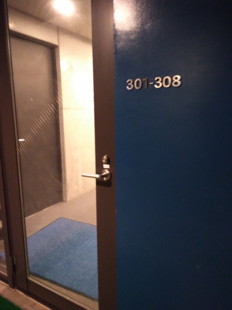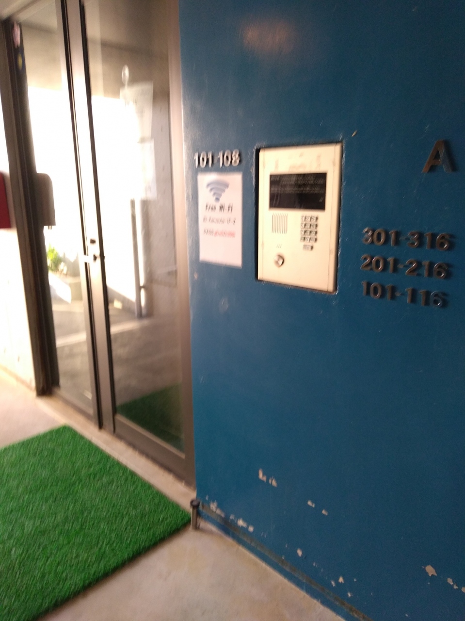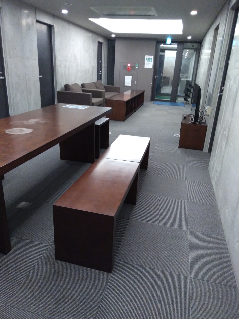 部屋の前の共有スペースにもソファーとテレビがあって奥にキッチンがありました。長期滞在に向いてそうな感じでした。