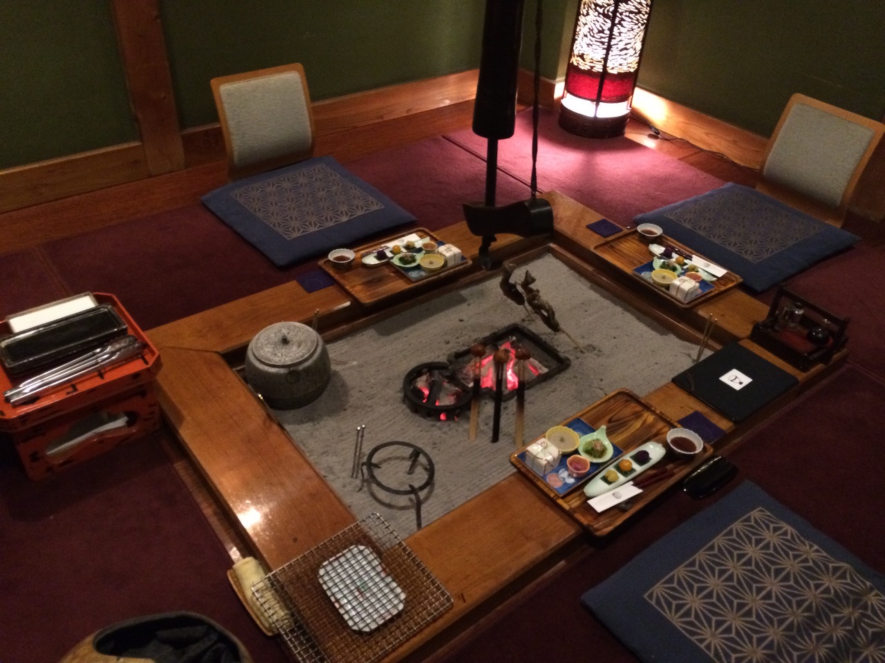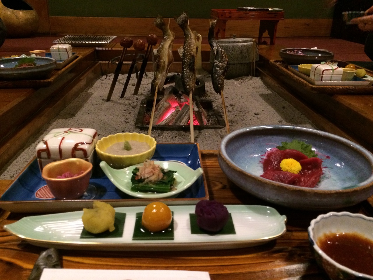 そして何より囲炉裏を囲みながらの料理は、雰囲気・味・量共に大満足です。いろいろな料理が楽しめるプランにしたのもありますが、お肉だけでも鶏・豚・牛・馬と種類豊富。囲炉裏で焼いた魚も、近くの川で獲れたものだそうです。鍋も美味しかった!