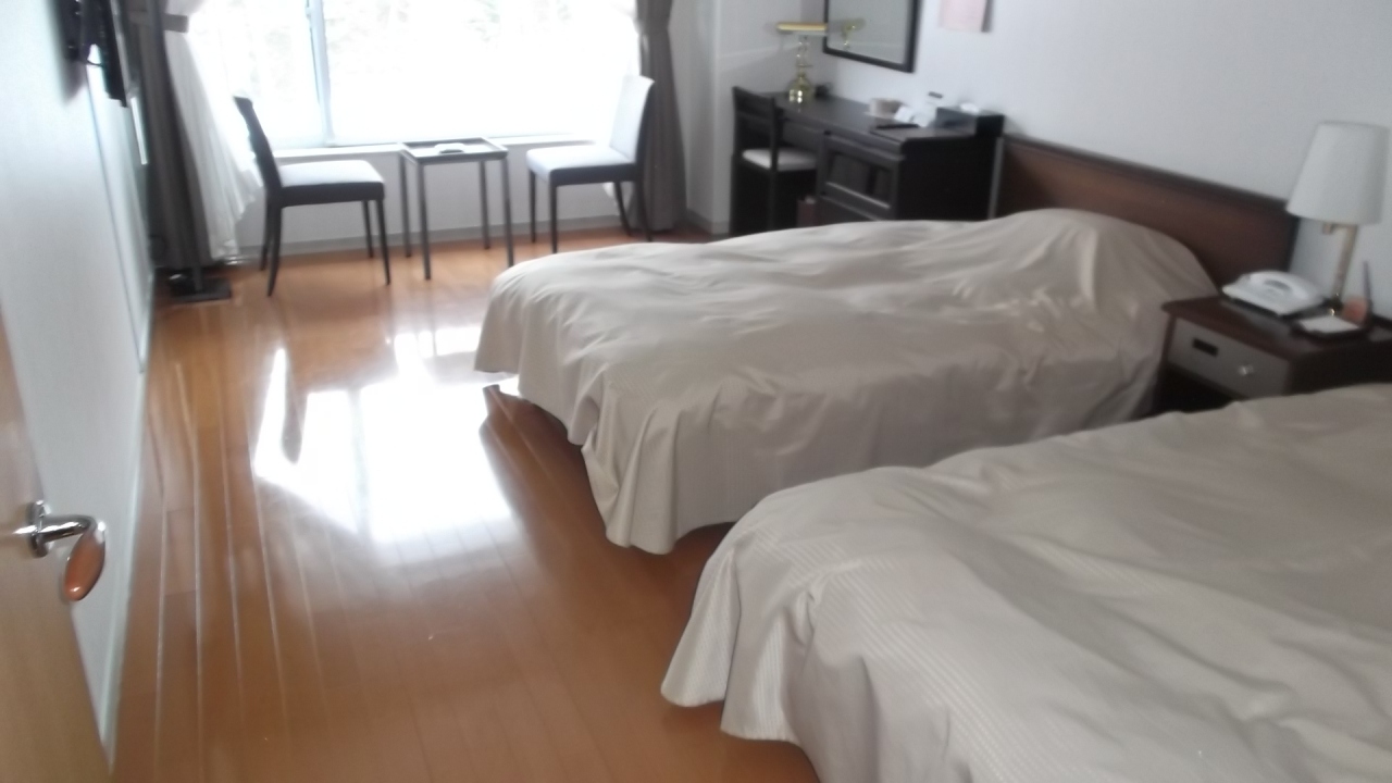 外観はそうでもないが館内はとても綺麗で清潔、部屋は一人なのにツインベッドルームだ。温水洗浄トイレにアメニティ・靴下も用意されていた。
