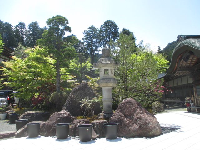 高野山のメインストリートにあります。宿坊らしいですが、入口に立派な石碑があり、お参りできるお寺です。こちらもお庭が見どころです。灯篭の周囲を囲む岩は、計画的にデザインされたもので、見る人を唸らせるものです。木々もよく手入れされています。