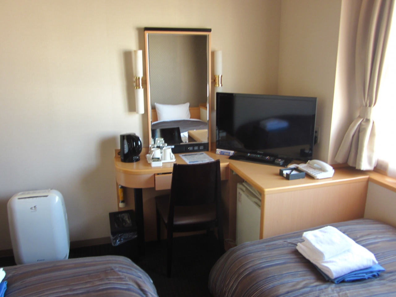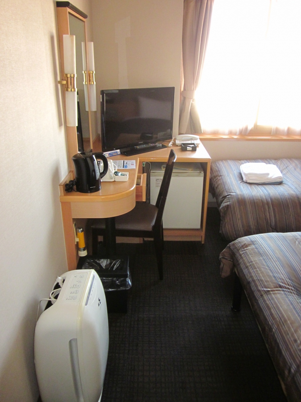 で今回予約したのは「エコノミーツイン・禁煙室」~、部屋に入って驚いたのは広さがシングルと全く同じ?…、そこにシングルベッド×2台有るものだから狭い!。