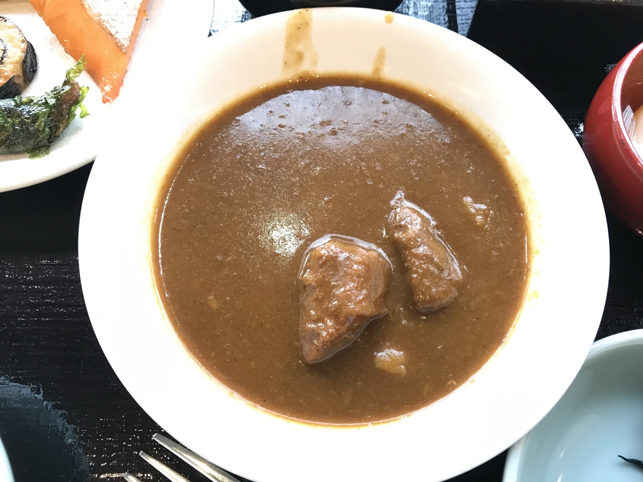 朝食バイキングの牛タンカレーとずんだ餅が美味しいです。カレーのルーに旨味があって、牛タンは柔らかく煮込まれていました。肉じゃがなどの煮物は東北地方の家庭料理風の味付けです。品数はそれほど多くはありませんが、少数精鋭で笹かま、仙台長茄子漬け、紫蘇巻き味噌、白石ウーメンとご当地の食材をいただけます。