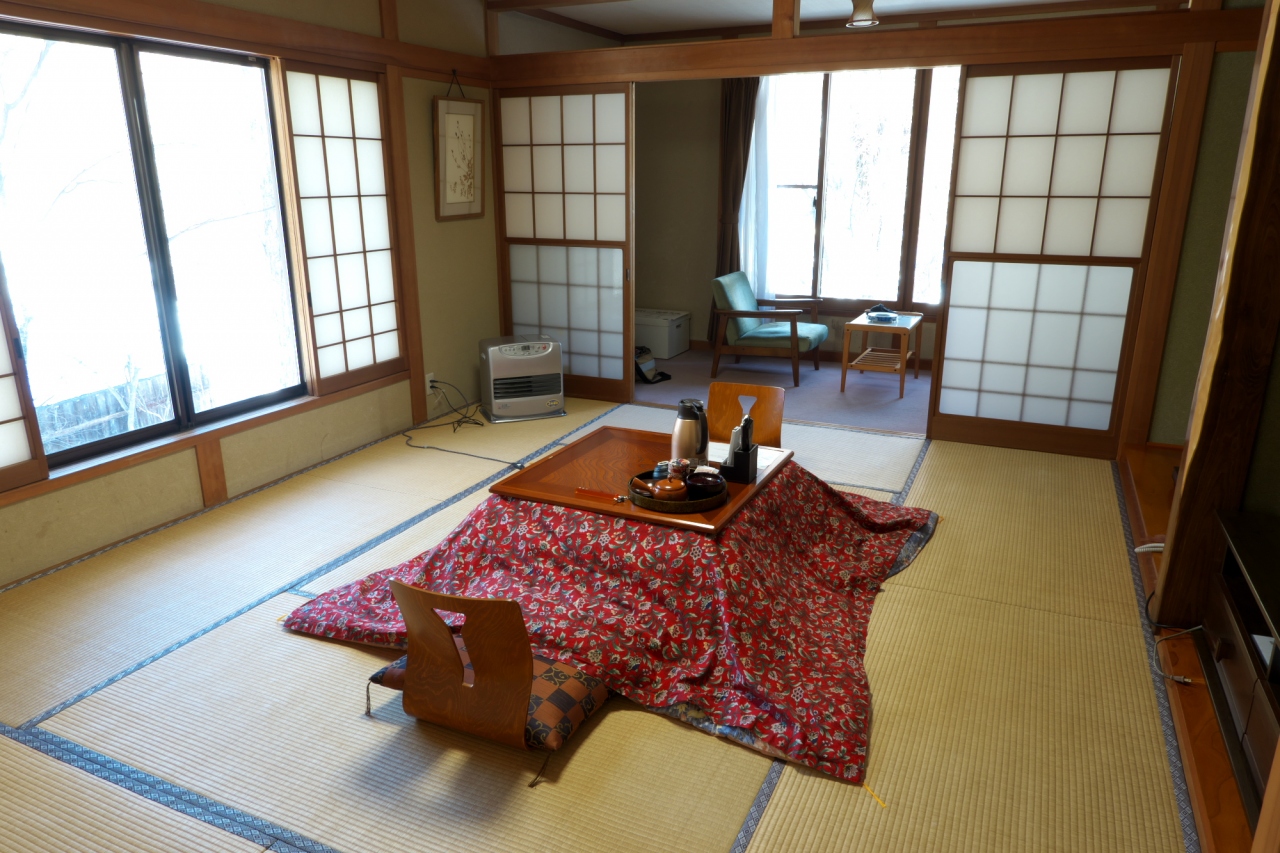 部屋に加湿器がない。もちろん加湿機能付き空気清浄機もない。暖房は石油ファンヒーターとコタツのみ。これで十分寒さはしのげるが問題は部屋の乾燥。室内がカラカラに乾いてしまうので、とくに喉が弱い方は対策が必須だろう。我が家はビショビショに濡らした大きなタオルを、持参した大型ハンガーに掛けて吊しておいた。しかも2枚(笑)。翌朝、2枚のタオルとも乾ききっていたので、それだけ湿度対策に貢献できてきるのだと思っている。実際、喉の痛みやイガイガは感じずに済んだ。なお布団は羽毛布団の下に毛布があり、さらに足元には湯たんぽが入れられている。かなり暖かいので、寝る前にヒーターを切っても朝まで寒さ知らずで寝られた。ただし顔だけは冷っこくなっているので肌が敏感な方は何か対策が必要かも。なお客室は喫煙可。パブリックスペースは禁煙。