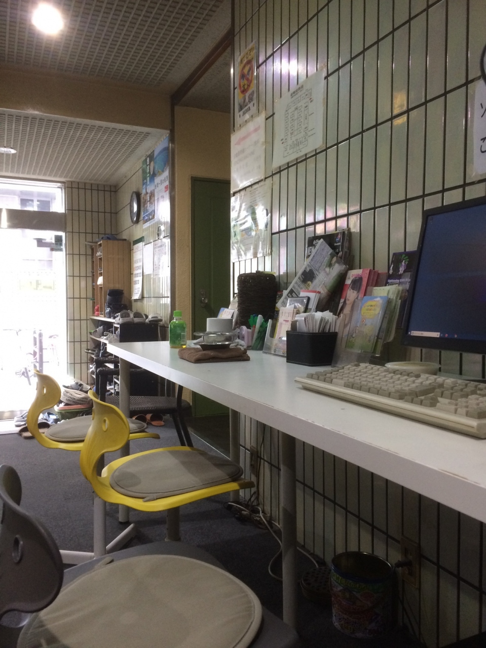 フロント付近は休憩スペースも兼ねていてパソコンが置いてあったので調べ物も出来ました。大浴場完備の格安宿で、部屋にはエアコン、テレビ、ミニ冷蔵庫がある狭い和室の部屋に泊まりましたが綺麗に掃除されていました。トイレは各階共用で洋式のウォシュレット完備のものもあり、廊下には電子レンジもありました。歯ブラシ、タオル等はなかったですが居心地が良い宿でした。