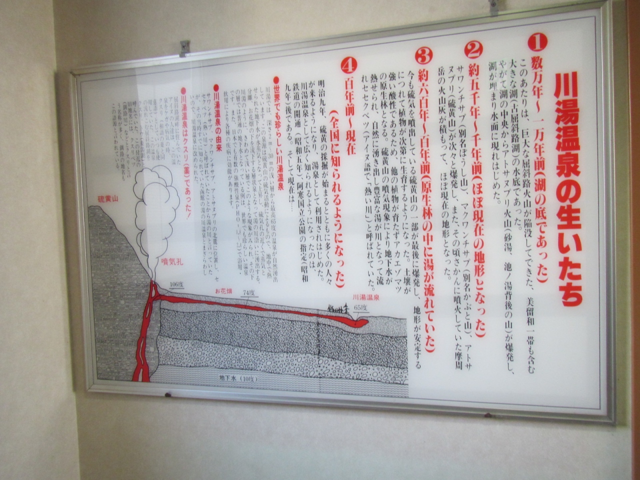 温泉は、川湯温泉の特質で、pH1.7の強酸性(温泉分析表による)。 炭酸水は勿論、レモン水よりも、そしてお酢よりも強い酸性です。 まるで希塩酸に浸かった溶解寸前の実験材料ですね(^^;)。 そのため、泉質は無色透明ですが、味が苦すっぱいといったところ。 肌にキズ口がある場合や、柔らかい粘膜の部分が触れるとピリピリします。 特に目に入るとしみます( ;∀;)。 そのため、内湯には白湯である“真湯”があり、酸性のお湯の後に入って、温泉水を洗い流すのによいです。 香りについては、ふんわり硫黄の香りがして、いかにも温泉らしい雰囲気です。
