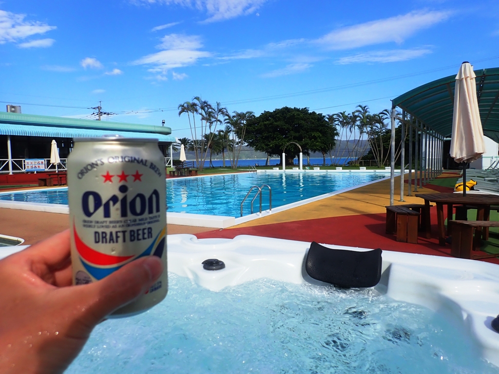 ダイバーにとっては、プールに併設されているジャグジーが冷えた体を温めるのに最適。ホテルの自販機でオリオンを仕入れて、「奄美の海 楽しかったよ、ありがとう。乾杯!」