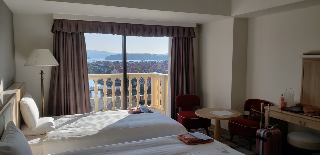 ハウステンボスの風景が部屋からも眺められ、JRの駅からも徒歩圏内です。