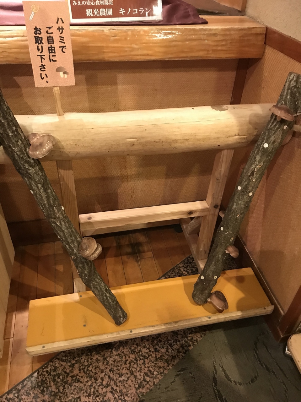 朝食はブッフェ方式なのですが、しいたけの原木が置いてあり、そこから利用客自らが収穫し、テーブルに備え付けの七輪で焼くことができました。