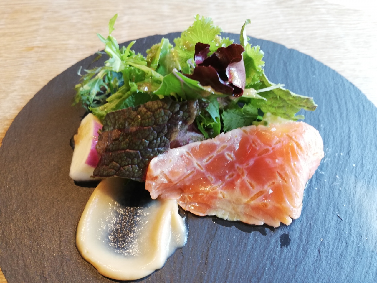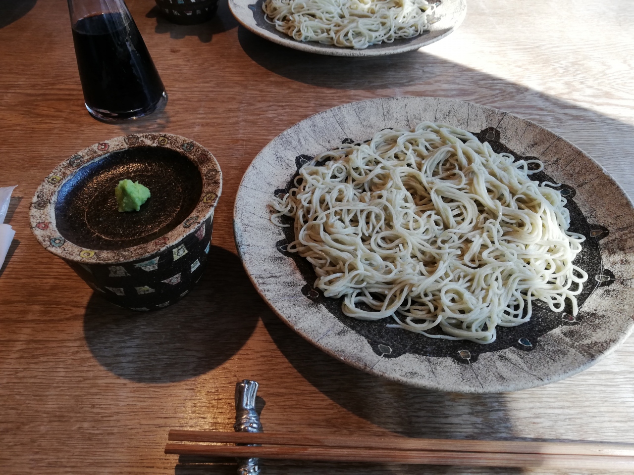 ランチで利用しました。土曜日の13時20分くらいに到着しましたが、待ち時間無しでの案内となりました。家族全員「蕎麦コース」を注文しました。前菜は「紅ますのサラダ」です。紅ますが炙ってありまして、脂ものっていて美味でしたね。そばは、「もりそば」・「牡蠣そば」・「イノシシそば」を注文しました。少し遅めに行った方がゆっくり出来ます。