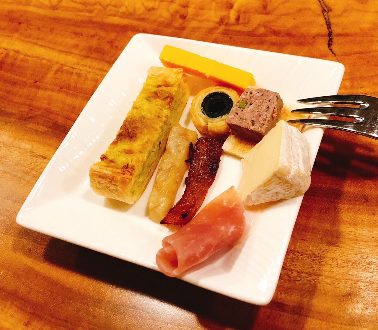 キッシュ 生ハム チーズ いかの燻製みたいなの オリーブのパイ巻き パテ(お肉の)