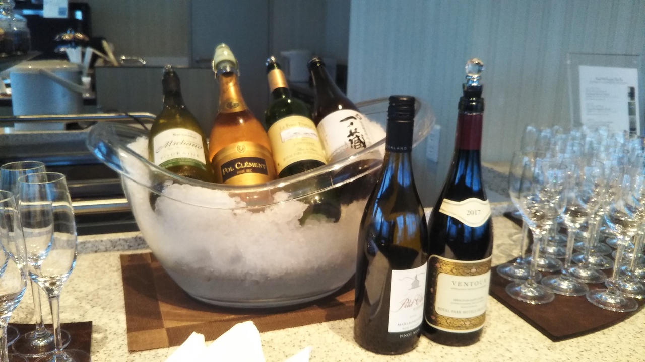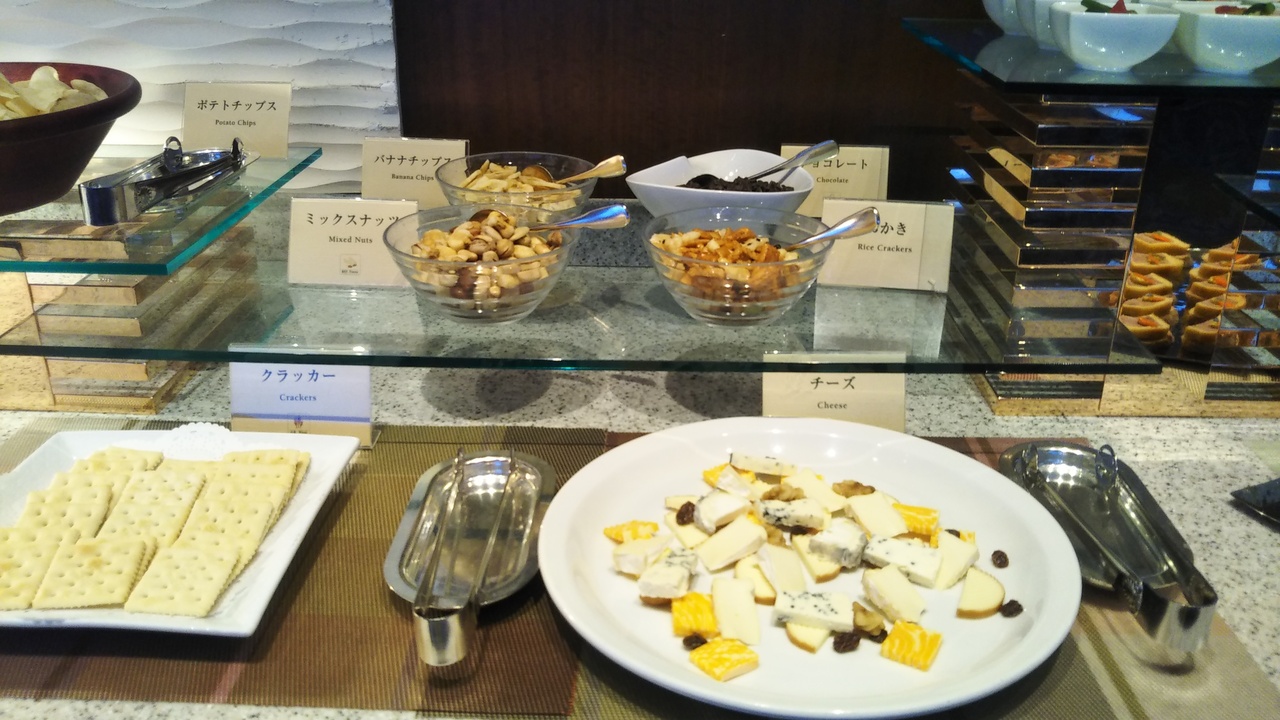 カクテルアワーの時間までリフレッシュメントが提供され、バナナケーキ、デニッシュパン、チョコレート、クッキー、金平糖などのお菓子とソフトドリンクがあります。