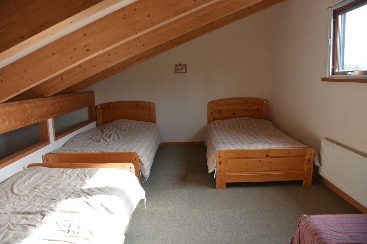 ベッドルームは階段を上がっていきます。ベッドは小さめですが、3つありました。屋根が斜めになっているので、頭をぶつけないよう注意が必要です。更に、2Fにもハンガーがあります。