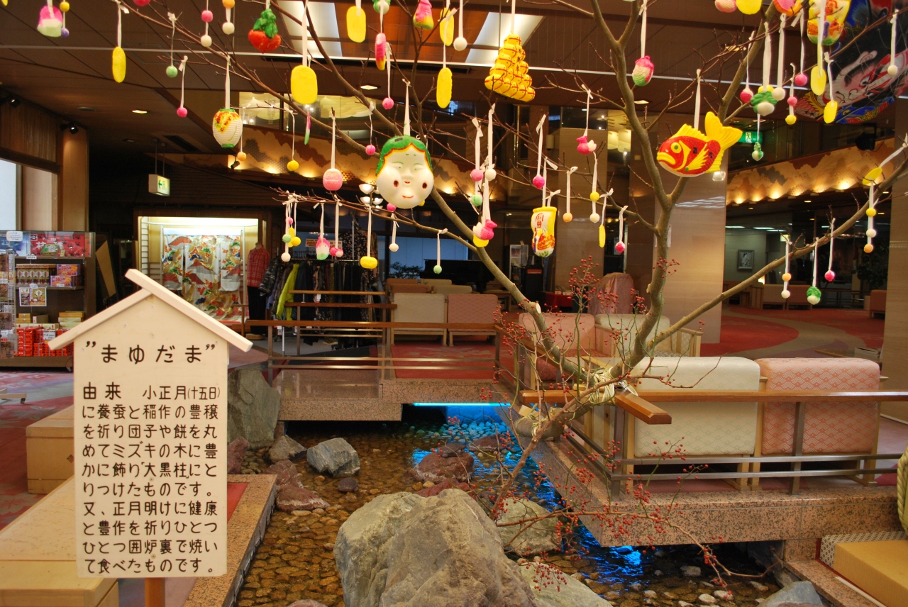 お正月のんびり過ごそうと伺いました。新年らしく広いロビーにはまゆだまなどが飾られ、樽酒もふるまわれていました。お部屋でいただいた食事はどれも丁寧に作られていて、ふだん少食の家族も完食するほどのお味でした。硫黄成分多めの温泉で疲れも取れました。