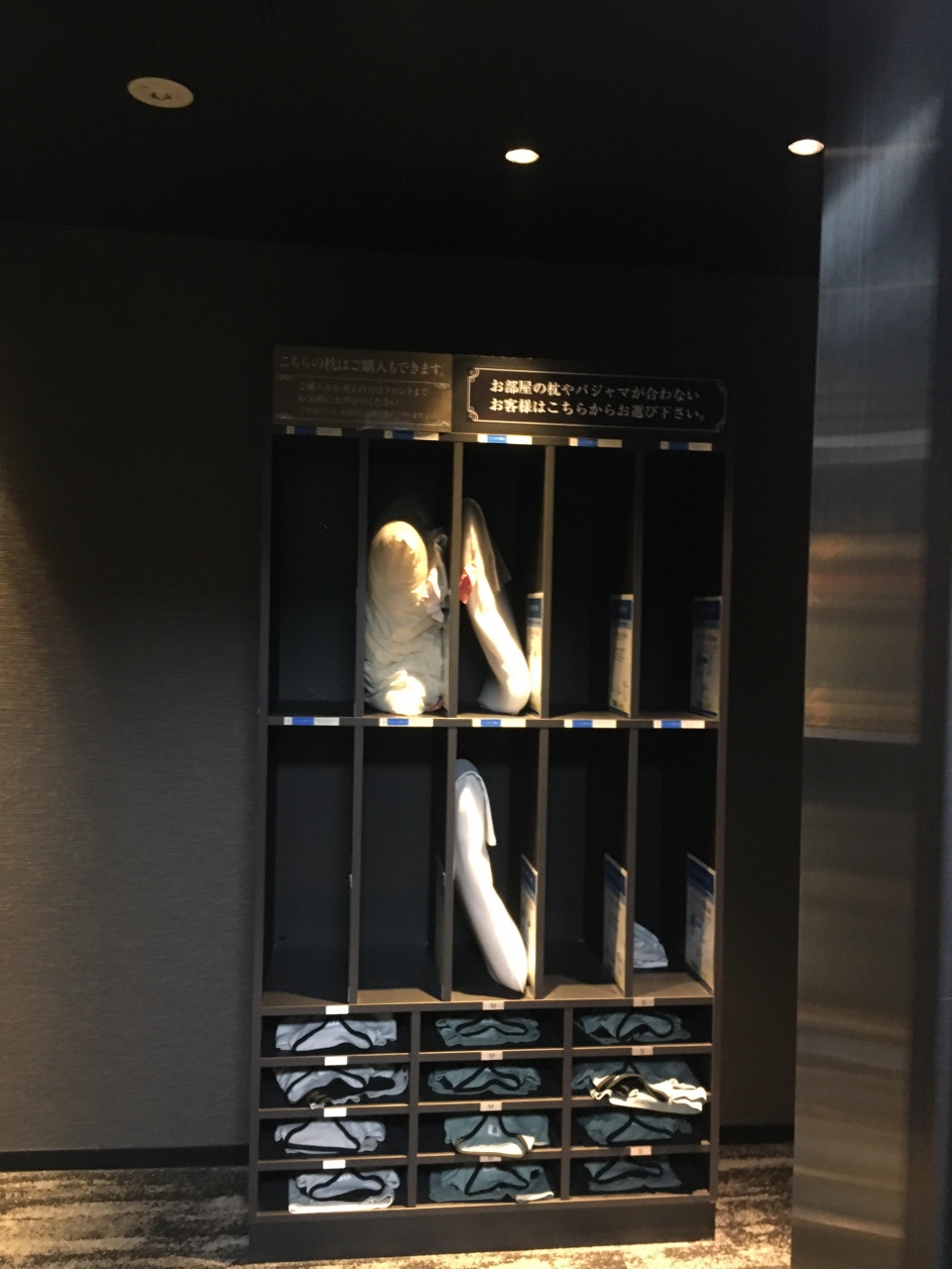 エレベーターを出ると選べる枕と館内着が置かれている。