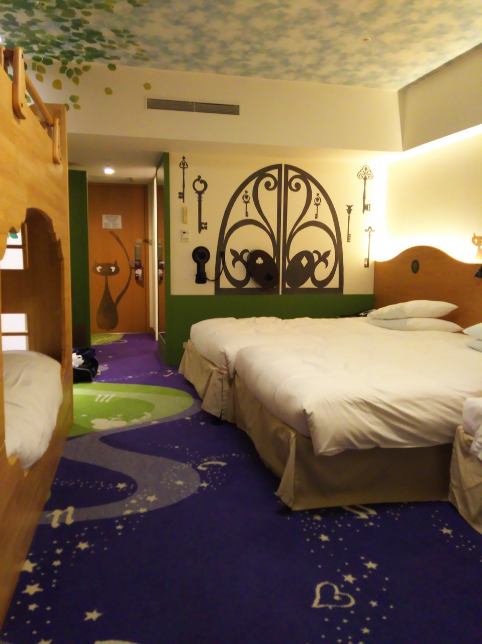 とても大きなホテルです。駐車場からもけっこう歩きました。車に忘れ物をして大変でした。動く歩道が欲しい距離です。ホテルは巨大でしたがチェックインカウンターが狭く三人づつしかチェックインできず行列でした。部屋は子供向けの可愛いデザインの部屋にしてもらいました。部屋内に仕掛けがあったり子供たちは大喜びでした。