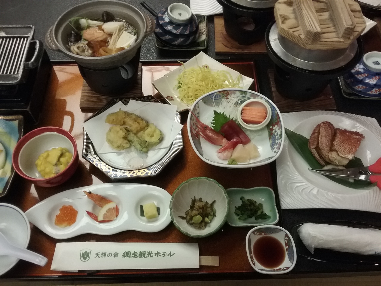 クラブツーリズムのツアーで利用しました。網走湖の高台にありお部屋から凍った湖が見えます。食事はバイキングでなく、毛ガニが半身つきました。いわゆる大衆ホテルのツアー食ですが、90分アルコール飲み放題も良かったです。大浴場はいつ入っても空いていてゆっくりできました。自力ではなかなか来れないロケーションですが、ツアーの団体には良い宿だと思います。