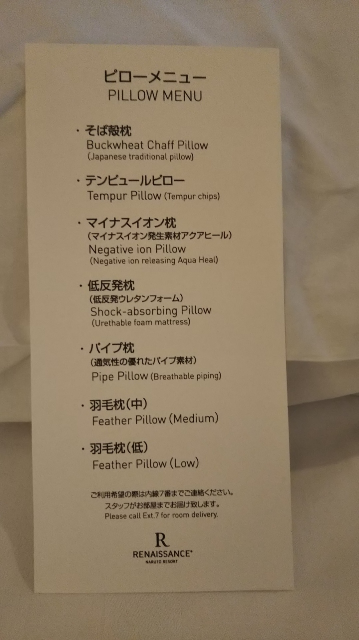 枕の種類が7種類から選べます。眠りにこだわる、現代人向けサービスかな。また、部屋に無料貸し出しのスマホも、有りました。