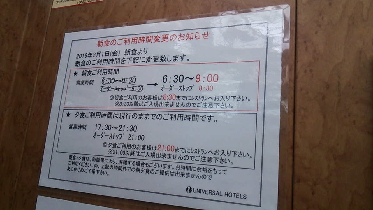 2019年3月23日に利用したのですが、2019年2月1日より朝食の時間が変更になった旨の掲示がありました。