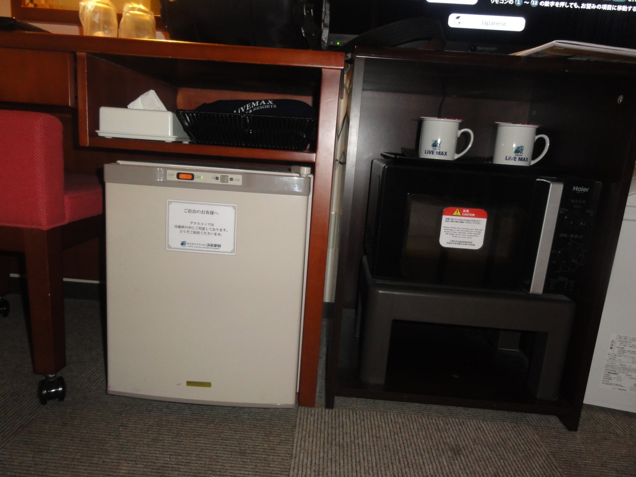 部屋には、使いませんでしたが、電子レンジもあり便利と思います。冷蔵庫も小型ですがありました。ただ、冷凍室がなく、保冷剤の冷凍することができなかったのは残念です。フロントにはさすが1円(同伴者も1円)で宿泊をした私には言えませんでした。