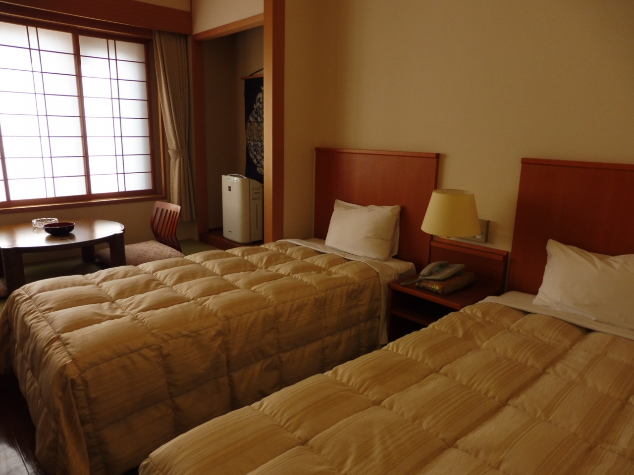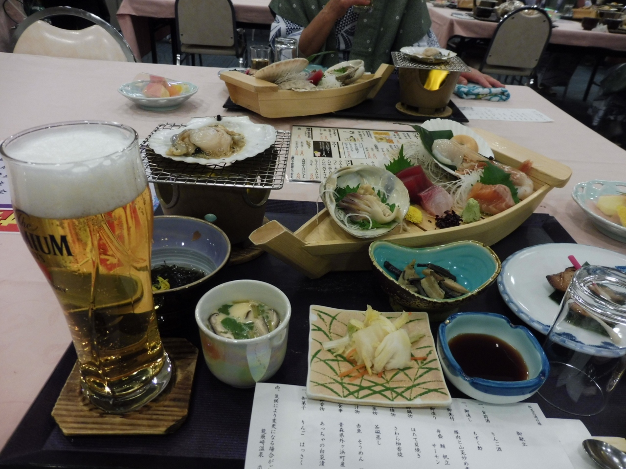 ホテルの下を北海道新幹線が通っており、通過するとわかるよう天井のランプが点灯するようになっています。食事は舟盛りや帆立焼きが美味しいです。