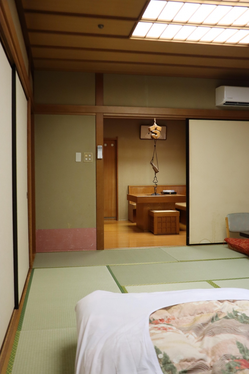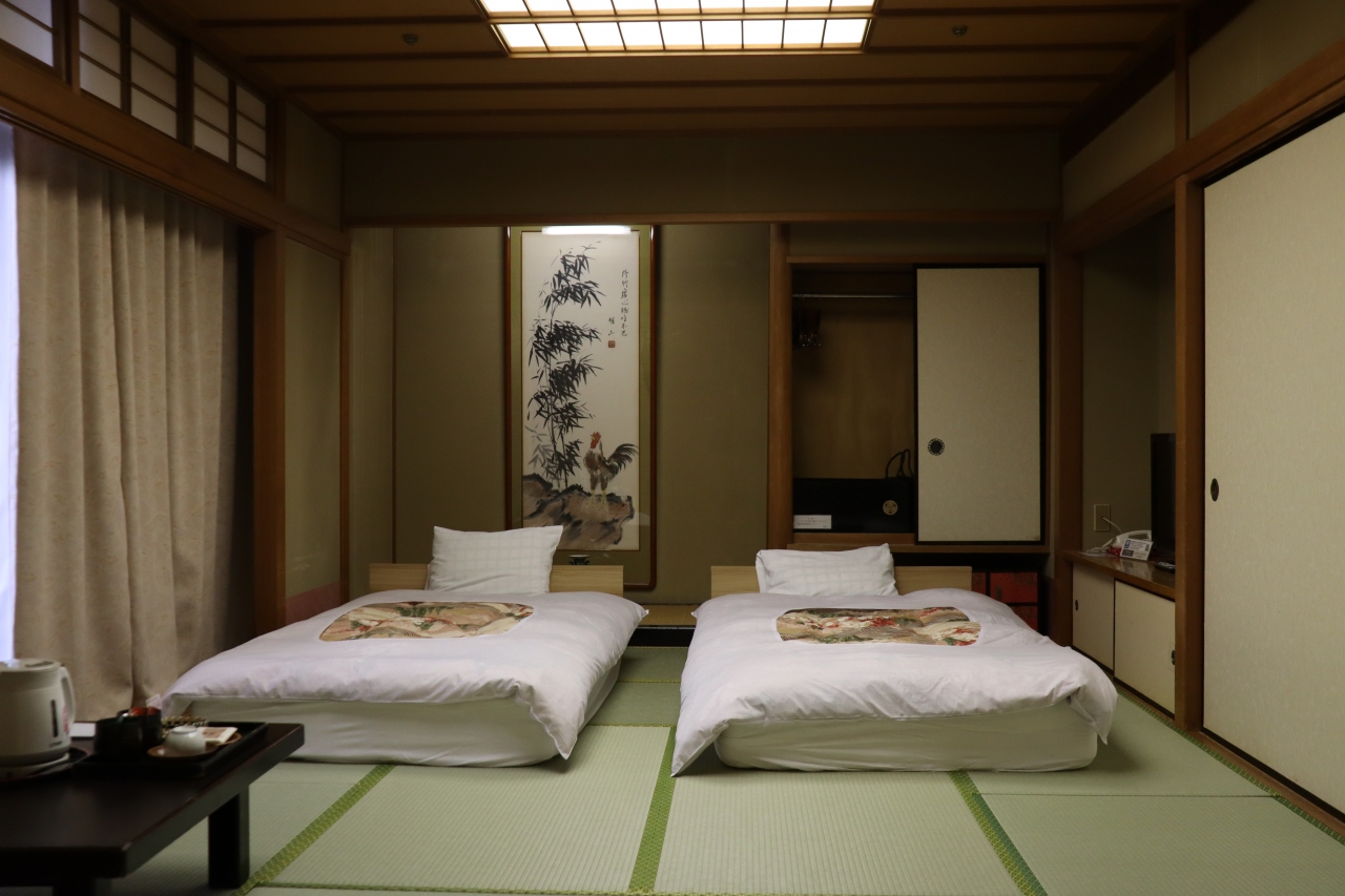 ツアーで利用。一人でしたが、広くて次の間には囲炉裏テーブルがありました。和室にセミダブルのベットが置いてあります。部屋の窓からの景色は良くありません。ロビーから大きな窓越しに人工の滝(壁の上部から水を流している?)があり、良い雰囲気でした。カウンターには無料のコーヒーが置いてあり、その横には名誉支配人と名誉若女将の高橋英樹、高橋真麻親子のポスターが置いてあり、ほっこりします。マッサージチェアが置いてあり無料で使えます。夕食・朝食ともバイキングでしたが、料理の味が良かったです。特に茶わん蒸しは