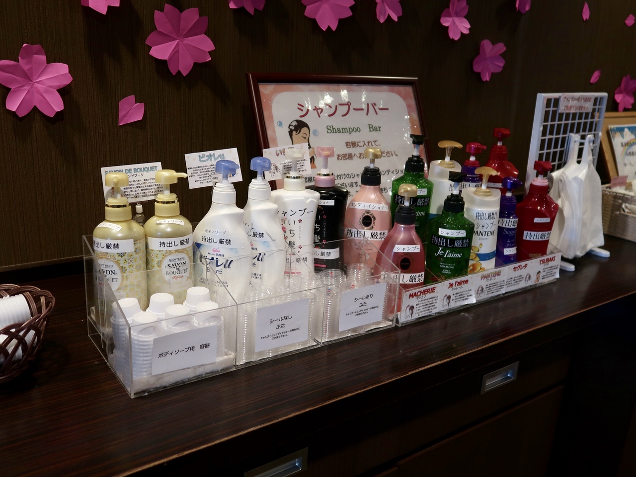 フロント横にアメニティバーがあり、自由に持っていけるが、シャンプーコンディショナーと入浴剤は小さい容器に入れて