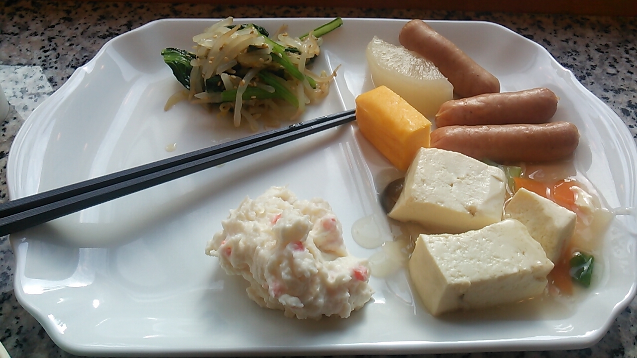 2019年4月7日(宿泊日2019年4月6日)の場合になりますが、ご飯は①白米②炊き込みご飯③柴漬けご飯の3種類のご飯から選ぶことができ、おかずは卵焼き・ウインナー・ポテトサラダ・もやしとほうれん草の和え物・大根とウインナーのポトフ風煮物・豆腐&人参&筍のあんかけ等品数が非常に多く、満足しました。