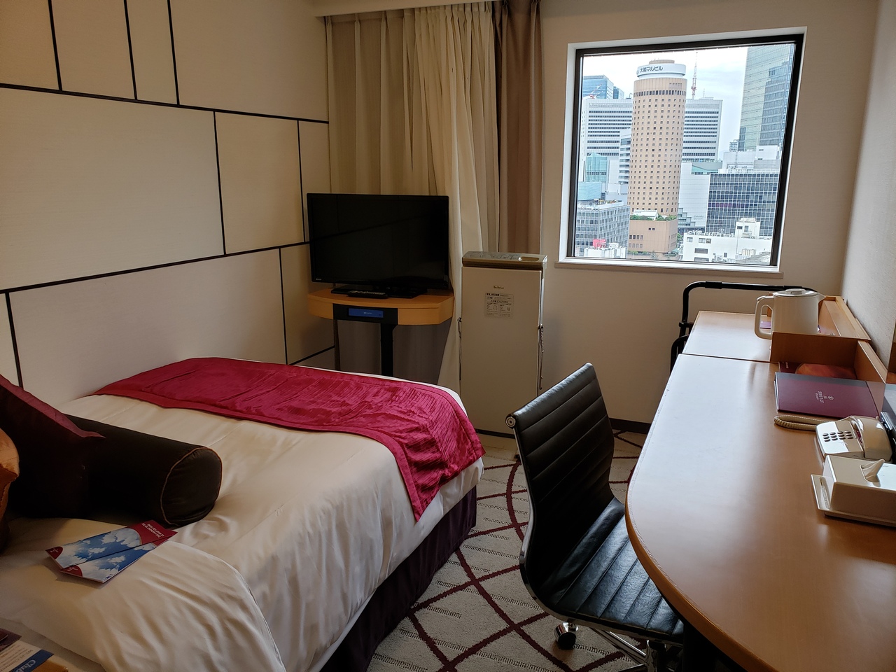 大阪駅から徒歩で15分程度、北新地のすぐ近くです。歩いても近いですが、JR大阪駅発着の送迎シャトルバスもあり、帰りはハービス降車も可能です。シングルの部屋はコンパクトながら、クラウンプラザのスリーブアドバンテージやズボンプレッサー、ケトルも完備で快適です。