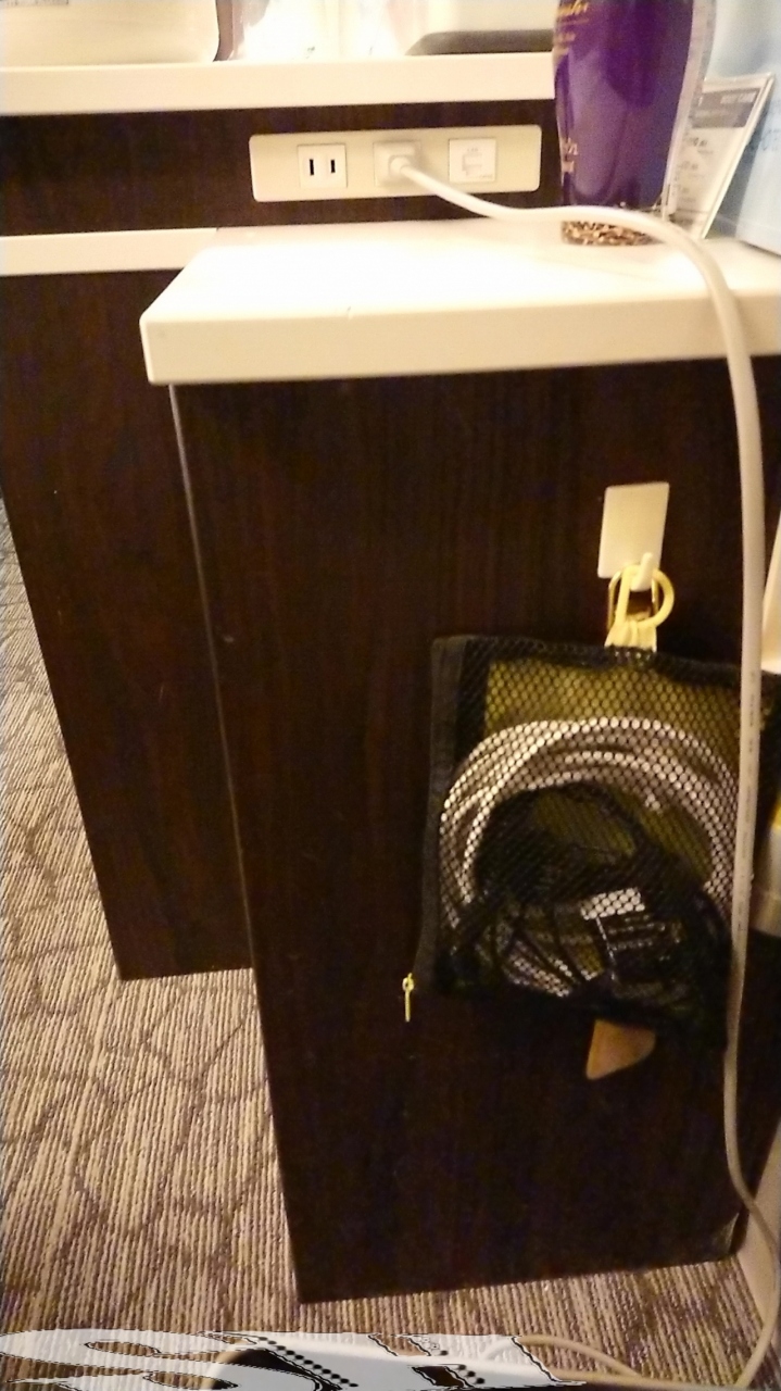 よく古いホテルだと電源がベッドから離れていたりしますが、デスクに2ヶ所、テレビ下と充電器が部屋に備え付けであり、そこのデスク脇にあります。備え付け充電器のコードも長くよかったです。