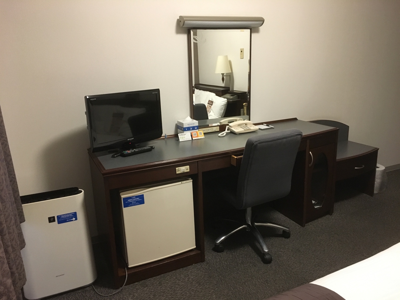 フロントの隣のラウンジスペースは朝食会場でもあり、朝食以外の時間帯に自由に利用できます。ホテルの近くには飲食店が何件がありますが、焼き鳥屋、焼肉屋、居酒屋ばかりです。そんな気分ではなかったので、ホテルの隣のスーパーで色々な惣菜を買ってホテルのレンジで温めたらラウンジスペースでいただきました。