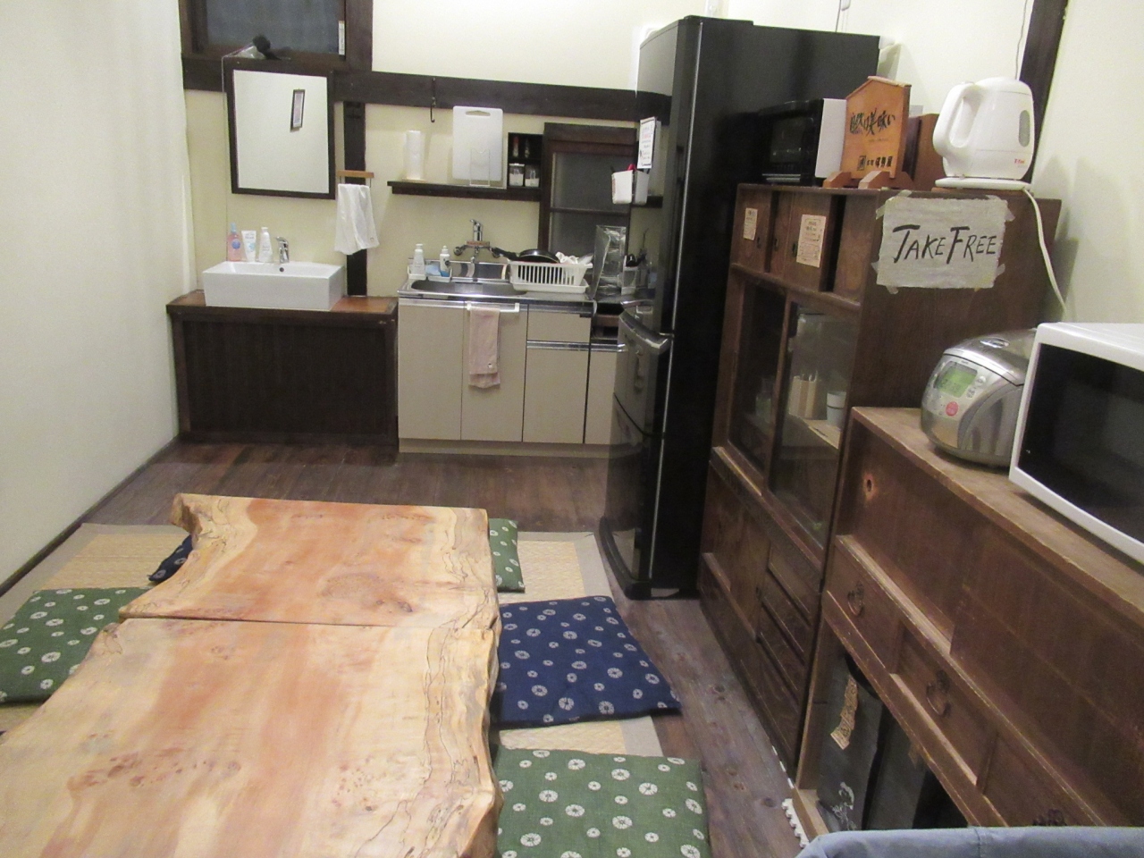 共用施設も充実していました。キッチンの他に、お酒も販売しているリビングスペースと、その上にもスペースがあり、計3部屋ありました。キッチンには食器やポットだけでなく、コーヒー、紅茶、味噌汁も用意されていました。