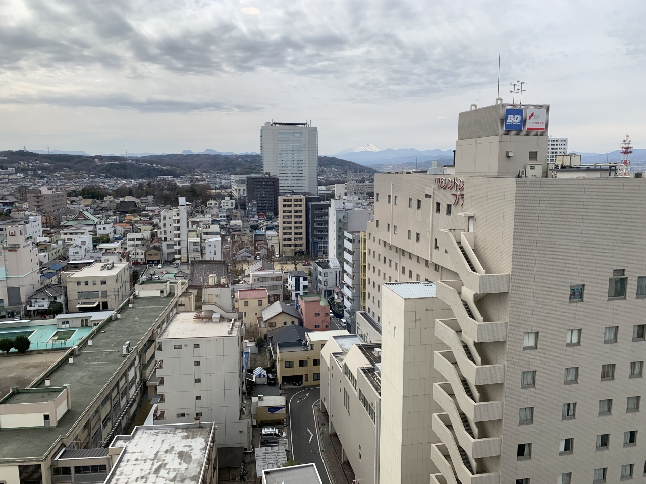 エレベーターホールからは高層の市役所がよく見えました。私が泊まった部屋は中庭に面していて、景色は良くなかったですが。