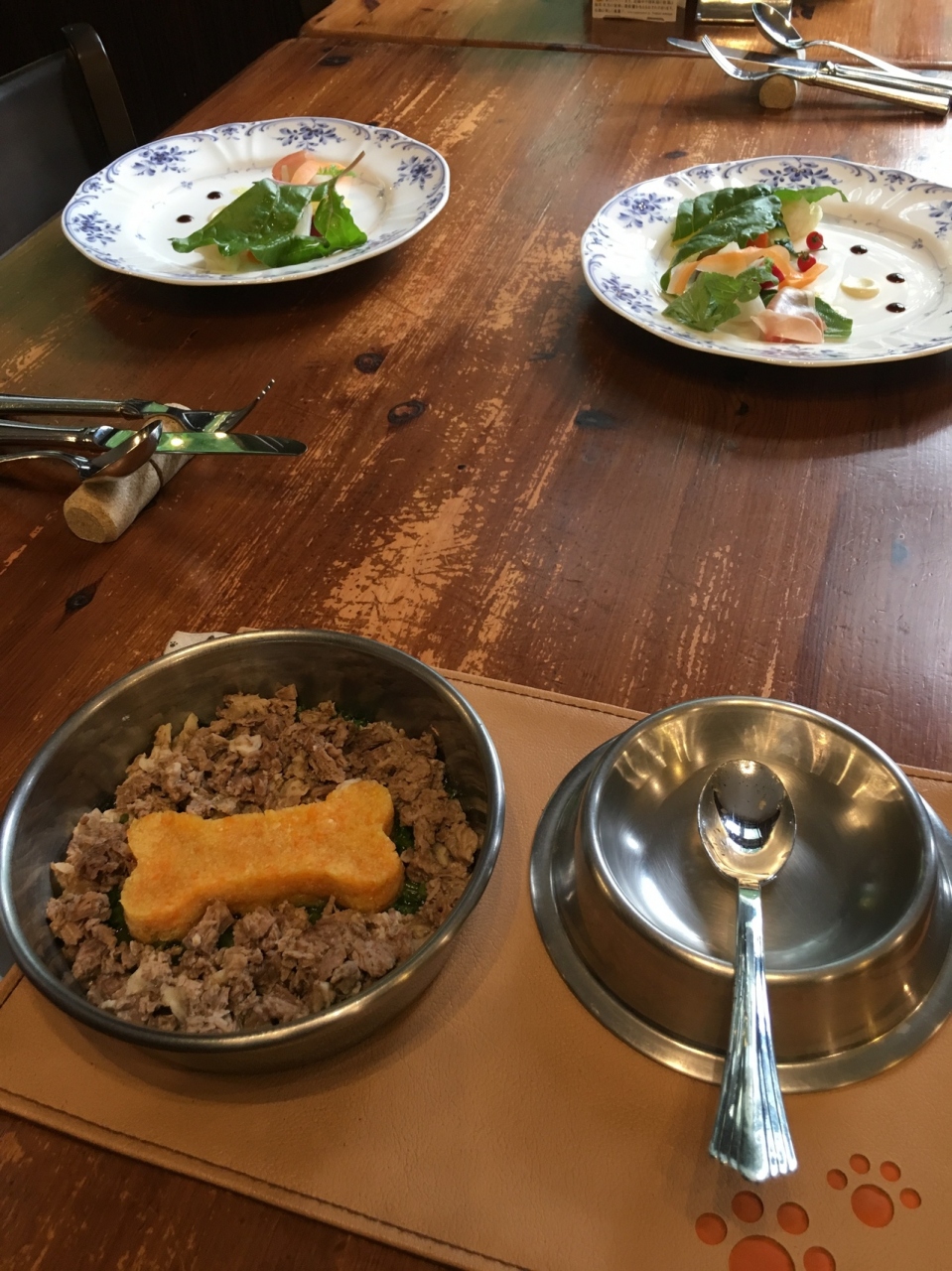 小型犬と宿泊しました。夕食朝食も愛犬用を頼んだのですが量が多くて食べきれなかったので残った分は部屋に持って行き、寝る前にまた食べさせてもらいました。となりの席の中型犬も量は同じでした。サーロインの夕食がとても美味しかった様で朝食のササミはあまり食べてくれなかったです。小型犬なら、夕食だけとかで