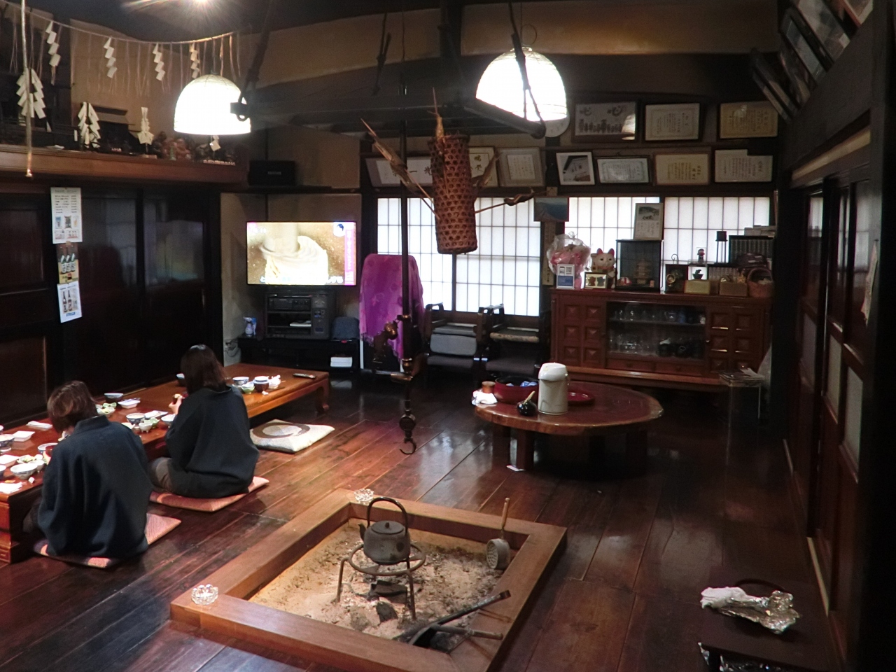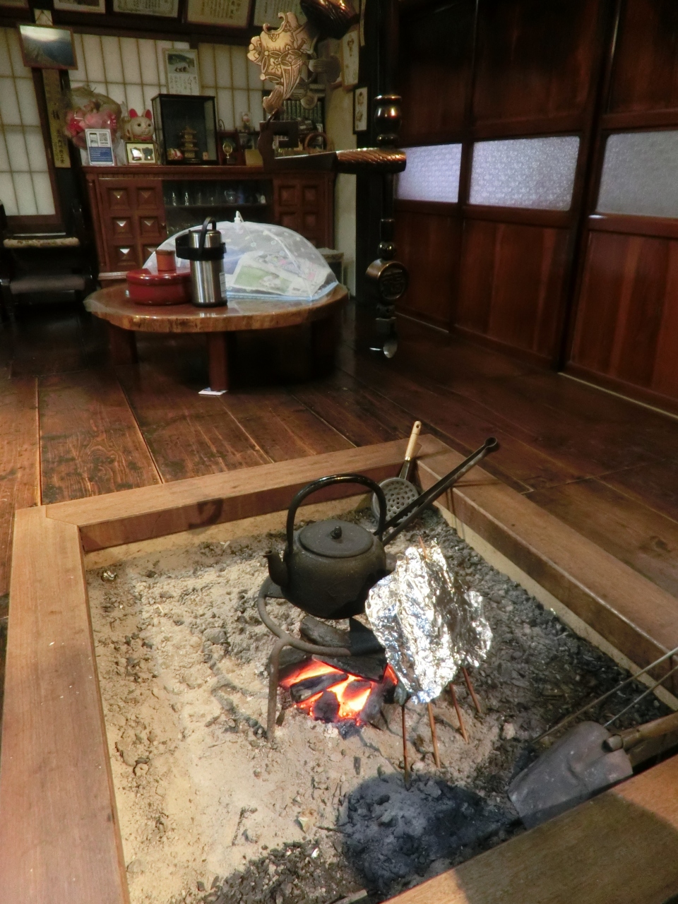夕食は囲炉裏がある食事処でいただきました。囲炉裏で焼いた岩魚を始め、