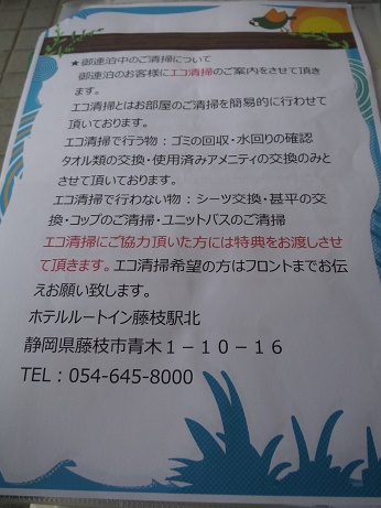 仕事で二泊利用しました。JR藤枝駅北口から徒歩でおよそ10分。1階に大浴場とレストランがあります。朝食は定番のスクランブルエッグやベーコンから、郷土色豊かな桜エビやわさび漬けなどがあり、充分楽しむことができました。ロビーにはコーヒーのベンダーがあり、紙コップに入れて部屋へ持ち帰ることができます。