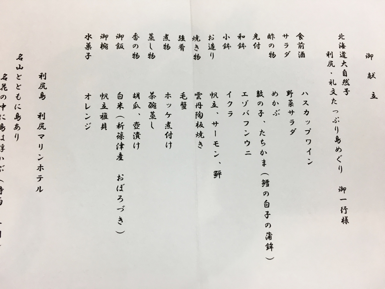 夕食のメニューはたくさん、はカニ、ウニ、イクラ、お刺身などいずれも新鮮で満足しました。朝食もバイキングではないので落ち着いていただけました。