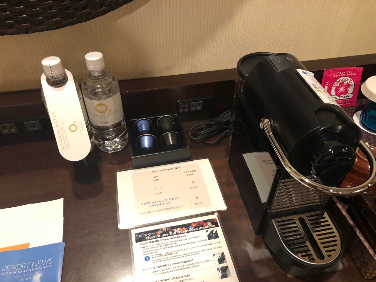 コーヒーマシーンや各種お茶、ペットボトルのお水も毎日テーブルに用意してくださりました。
